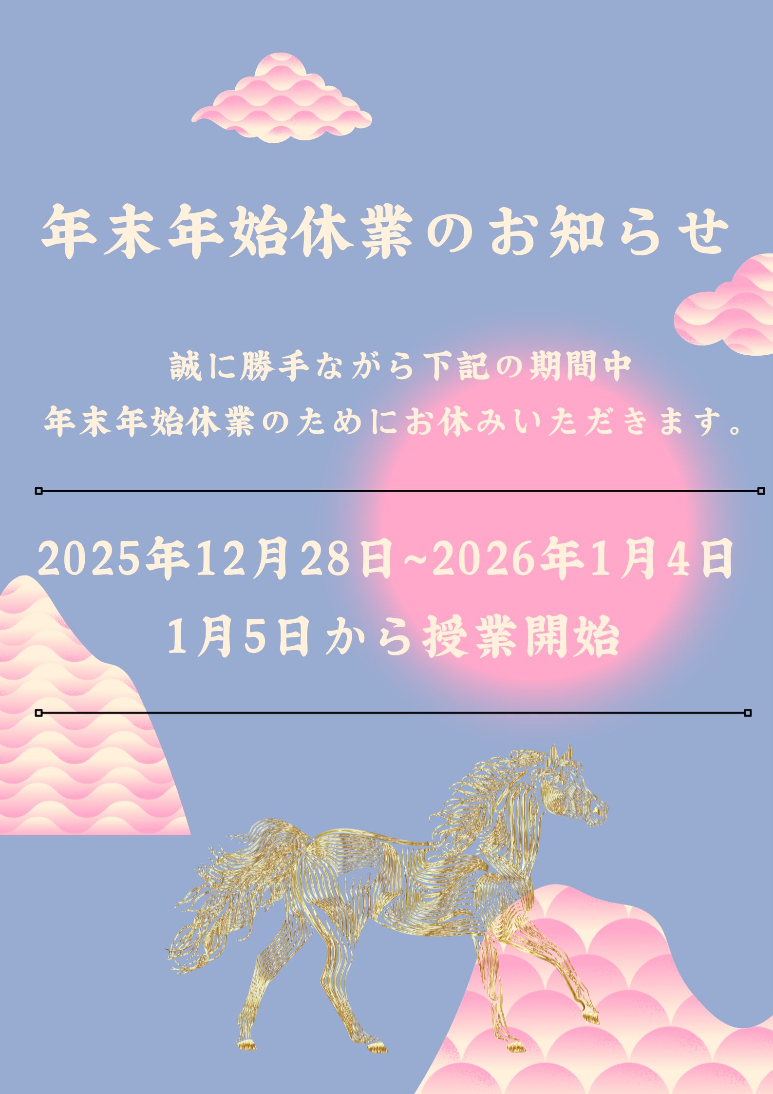年末年始お休みのお知らせ おしらせ 年末年始のお休みのお知らせ 2025年12月28日~2026年1月4日まで 年末年始のお休みさせていただきます。 授業の開始は1月5日から致します。 よろしくお願いいたします。